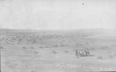 Ellen Henry Scranton Belden with William Henry Belden on a Democrat being Pulled by horse Sis and Buck in a filled of wheat chaff piles. Photo was taken in 1911, 1913, or 1916
