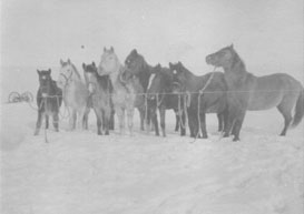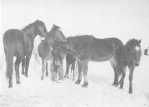 Horses tied to barb wire fence in the snow. Similar to PH-72