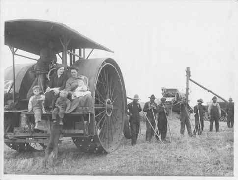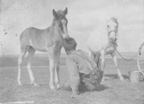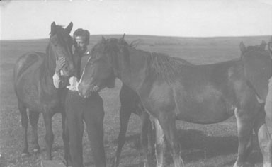Selden Belden in Sunday Clothes petting horses. Evelina Belden at very far right. Probably from 1913 or 1916